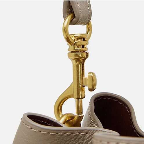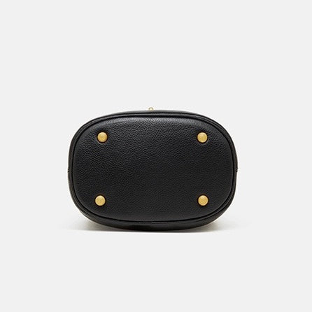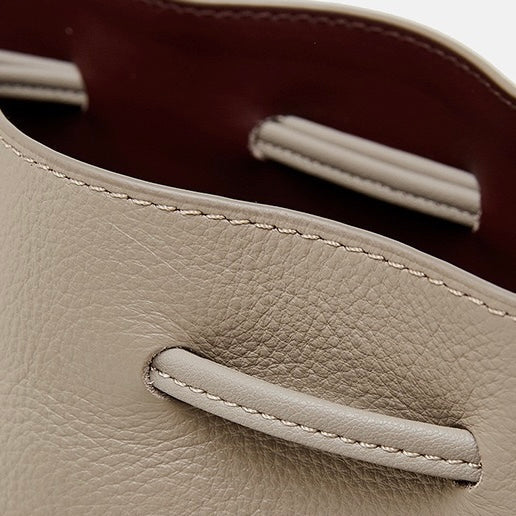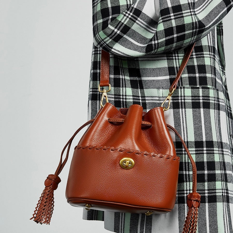 This new medium-sized bucket bag, crafted from genuine top-grain cowhide, features trendy fringe details and a secure lock. The bucket shape with a drawstring closure opens to a fabric-lined interior, including a zippered secret pocket. With medium hardness for durability, it works as a handbag or crossbody, blending practicality and style—ideal for daily outings, merging timeless leather quality with modern flair.